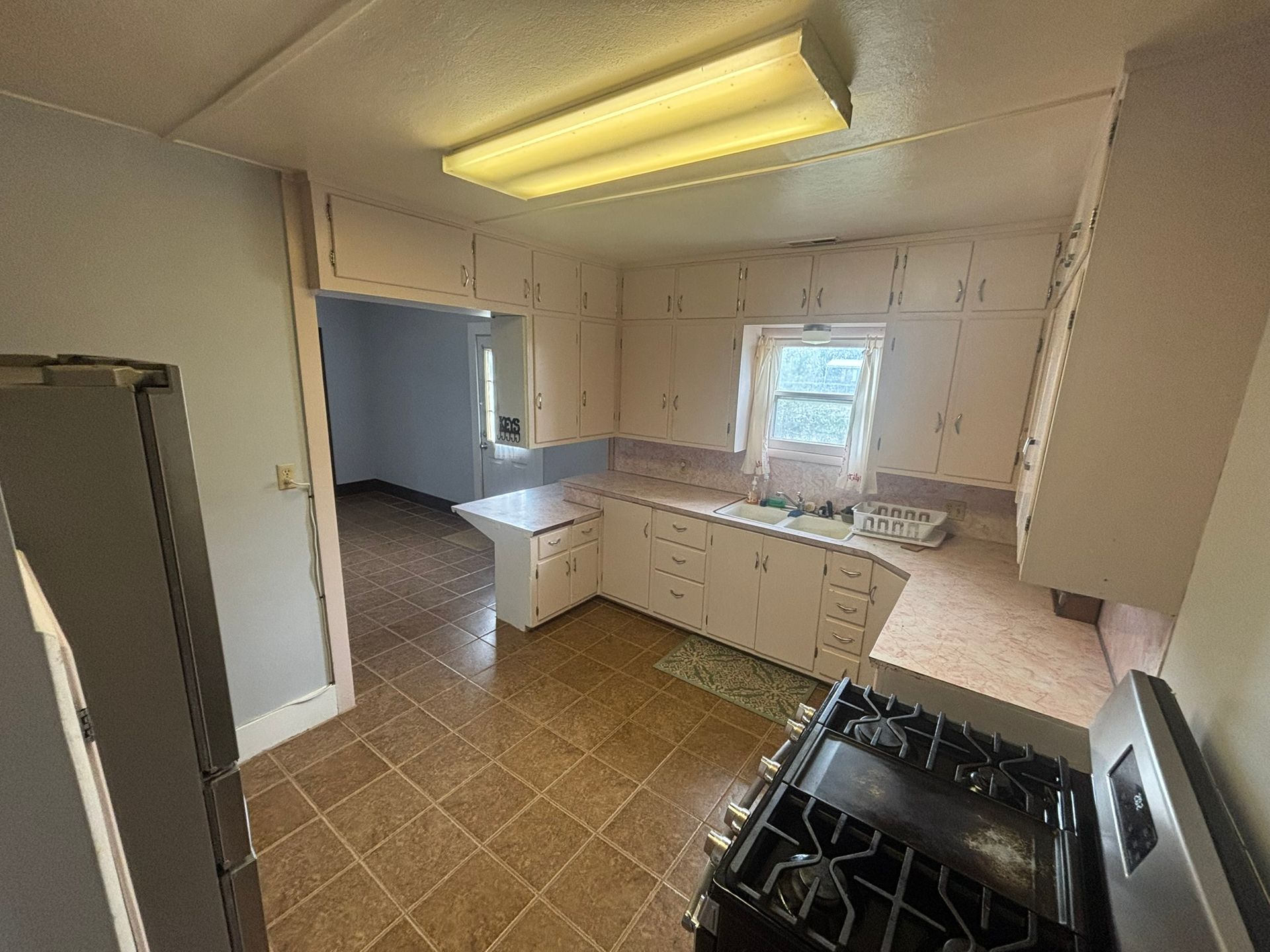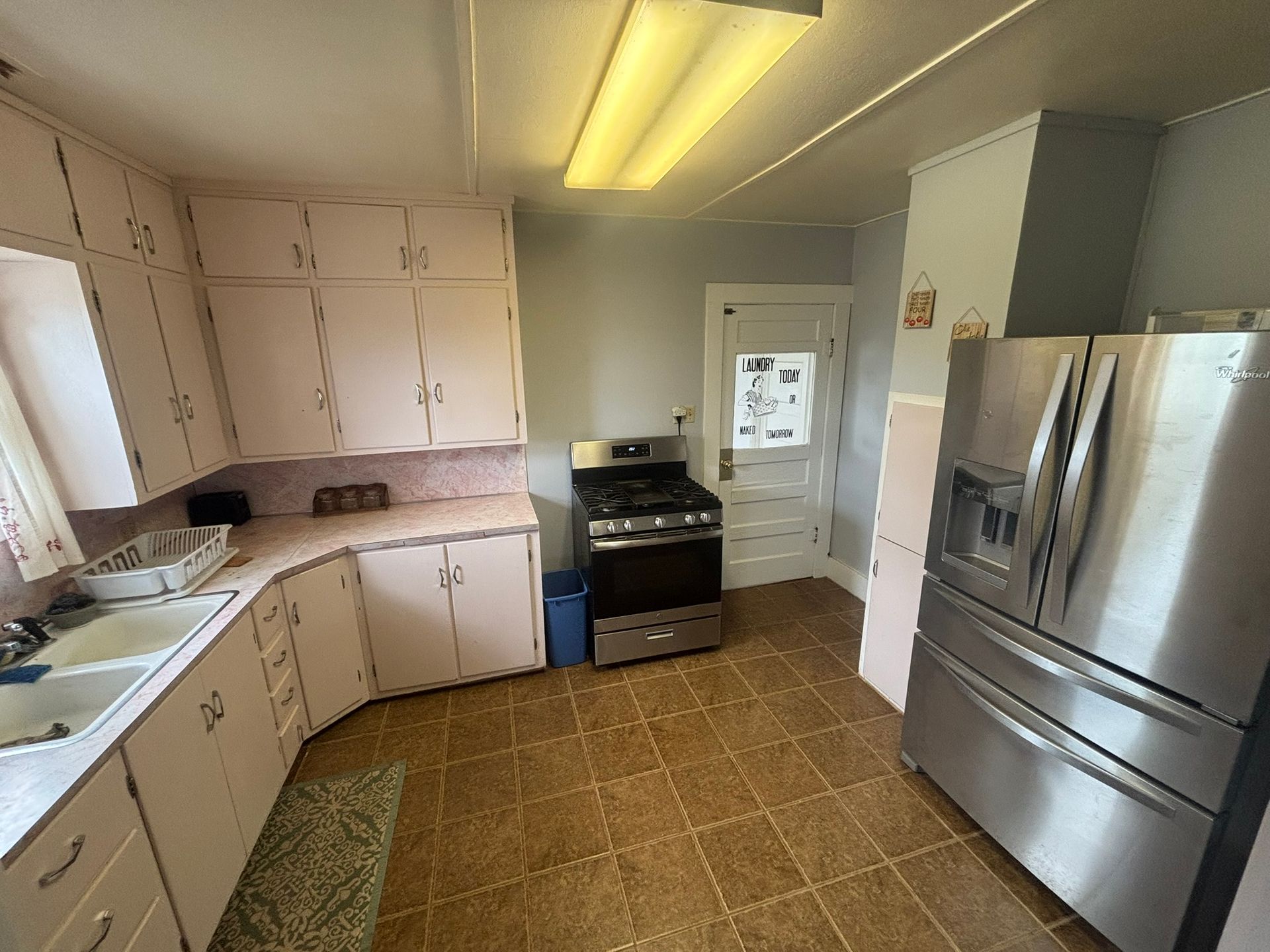 - Large 109 sf kitchen has 4 burner gas stove, Whirlpool refrigerator with indoor water & ice dispenser and French drawer, deep sink with window above, real wood cabinets with a Lazy Susan cabinet in the corner