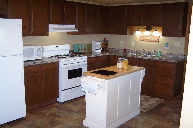 - Included is a brand new stove/oven with hood, Whirlpool refrigerator and microwave. The kitchen has a perfect sized island for additional space and just to stand around while cooking and talking. Countertops are Formica antique Mascarello laminate.