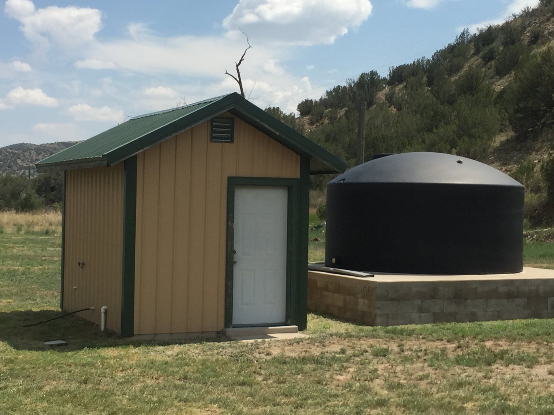 - 50 gpm water well 120' deep with water at 58' - 5 hp motor - 9'x12' pump house is completely enclosed and insulated with pressure irrigation controls. The 1,200 gallon polyeurethane water storage tank sits on a concrete platform.